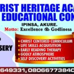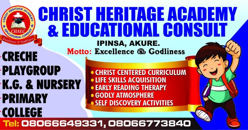 CHRIST HERITAGE ACADEMY AND EDUCATIONAL CONSULT (Formerly known as God’s Heritage Schools) is a Christian co- educational institution having Creche, Nursery, Primary and Secondary (in the pipeline) located in Ipinsa, Akure, Ondo State, Nigeria. The academy plans to offer boarding facilities in the nearest future as the Lord enables.